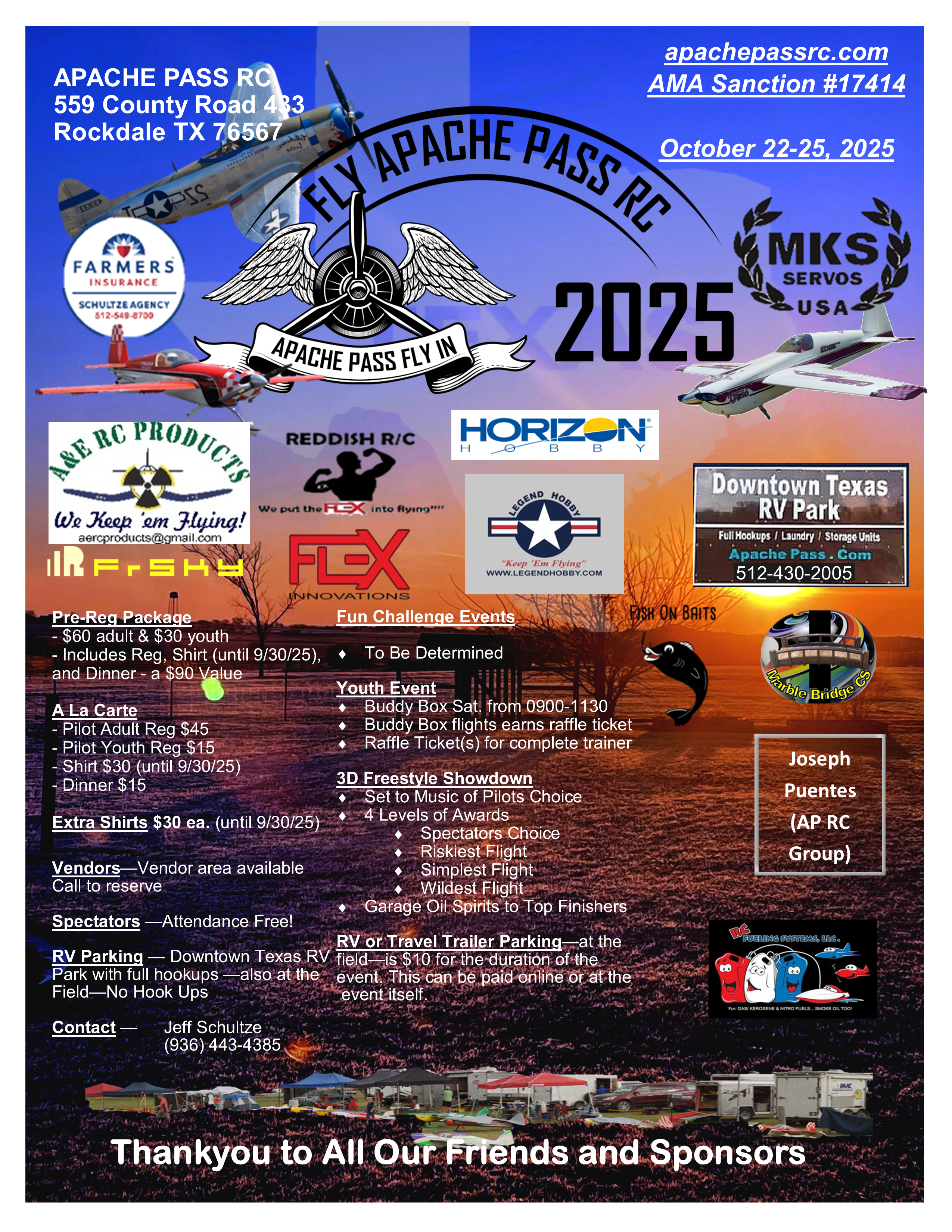 At least 2 flight lines, tons of fun, great friends, raffle, night flying, food trailer, on-site vendors, RV park nearby, we’ve got it ALL.